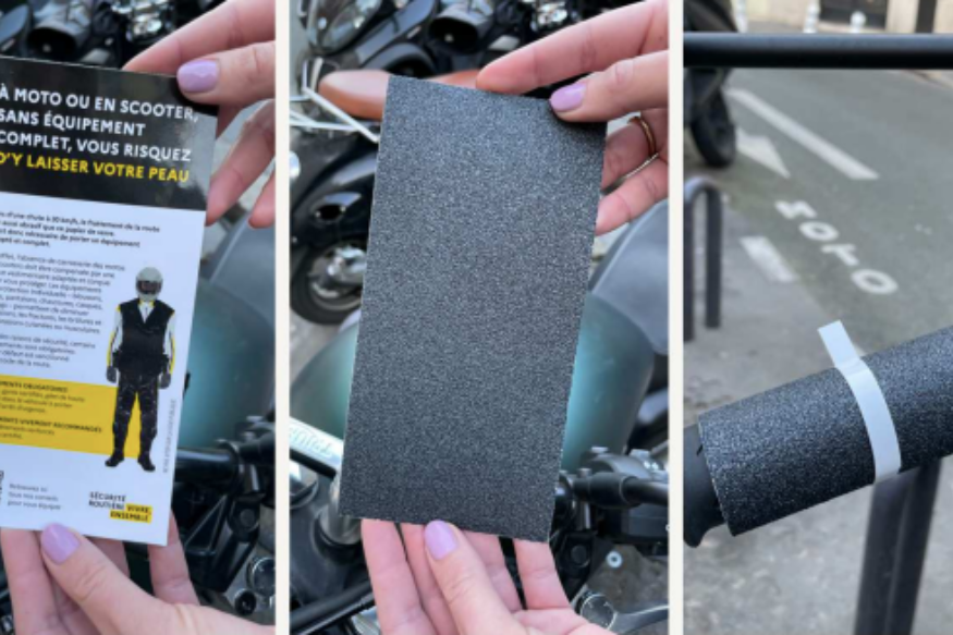 À moto ou à scooter, sans équipement complet, vous risquez d’y laisser votre peau ! C’est le slogan de la nouvelle campagne de la sécurité routière. Des milliers de flyers vont être accrochés ces jours-ci aux guidons des deux-roues motorisés à Marseille, Nice, Lyon, Bordeaux, Montpellier, Paris et Lille. Leur particularité ? Un verso abrasif en papier de verre qui simule le frottement de la route en cas de chute. Car si les beaux jours reviennent, ce n’est pas une raison pour se dévêtir !