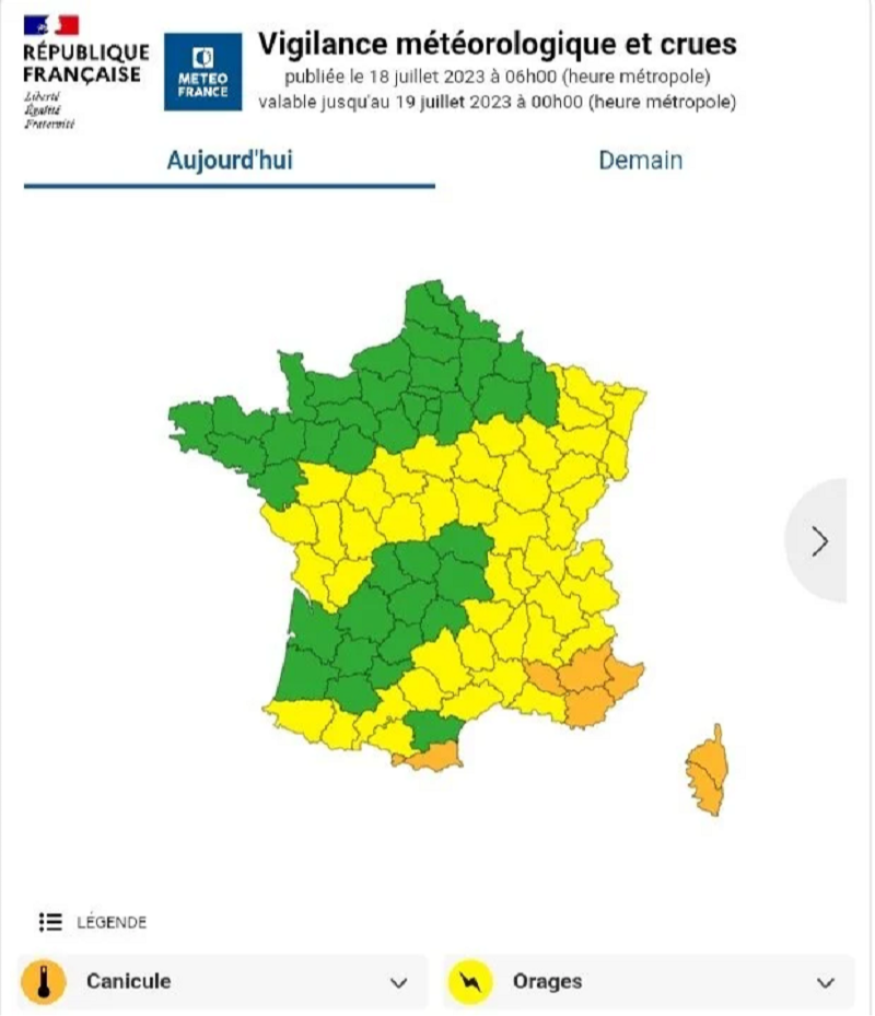 10 départements du Sud-Est placés en vigilance orange canicule à partir de demain. L'alerte canicule de Météo-France s'étend à trois nouveaux départements. Dès demain, le Gard, les Bouches-du-Rhône et l'Hérault seront placés en vigilance orange à cause des fortes chaleurs. Ces départements s'ajouteront au Vaucluse, du Var, des Alpes-de-Haute-Provence, des Alpes-Maritimes, de la Haute-Corse, de la Corse-du-Sud et de la principauté d'Andorre déjà concernés aujourd'hui.
