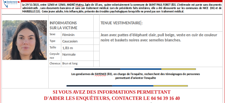 La gendarmerie de Fayence a lancé un appel à témoin pour retrouver Maëna André. Cette jeune fille de 18 ans a disparu le 29 novembre à Saint-Paul-en-Forêt. Elle est brune, portait un jean avec un pull beige et une veste en cuir noire.