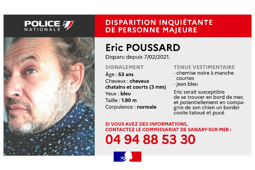 Le commissariat de Sanary lance un appel à témoins. Eric Poussard, 53 ans, n'a plus donné de signe de vie depuis dimanche dernier. Il était dans le secteur de Six-Fours / La Seyne.